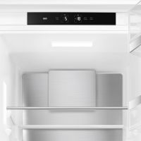 Внутренняя организация холодильника продумана до мелочей. Он оснащен тремя регулируемыми стеклянными полками, одной фиксированной полкой, а также полкой для бутылок и подставкой для яиц. Кроме того, в холодильной камере есть ящик для овощей и фруктов и две регулируемые полки на двери. Ее общий объем составляет 182 литра.