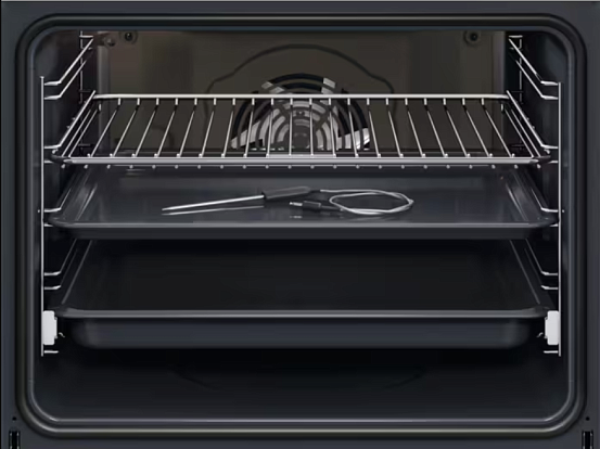 Интерьер камеры продуман для удобства и гибкости: пять уровней размещения решётки и противней дают простор для экспериментов с несколькими блюдами одновременно. В комплекте идут два противня и одна решётка, а съёмные телескопические направляющие упрощают работу с горячей посудой и повышают безопасность при вынимании блюд. Дверца откидная с технологией плавного закрытия и тройным стеклом снижает потери тепла и обеспечивает комфорт при эксплуатации, а галогенное освещение камеры делает процесс контроля за приготовлением простым и наглядным даже при закрытой дверце.