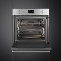 Духовой шкаф Smeg SOP6302S2PX оборудован дисплеем с сенсорным управлением, на котором отображается выбранный режим, время работы, таймер и установленные функции. Модель имеет 12 режимов приготовления, среди них, есть функция для пиццы. Имеется блокировка управления от случайного нажатия.