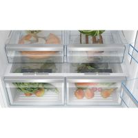 В холодильной камере установлены три полки, две из которых регулируемые, а одна - фиксированная. Такое решение позволяет максимально эффективно использовать пространство внутри холодильника. Кроме того, в холодильнике есть полка для бутылок и шесть полок на дверце, что обеспечивает дополнительное пространство для хранения продуктов. Морозильная камера расположена снизу и оснащена системой охлаждения No Frost. Это позволяет сократить время размораживания и увеличить срок службы устройства. В морозильной камере установлены три ящика, включая большой ящик BigBox, который идеально подходит для хранения крупных продуктов.