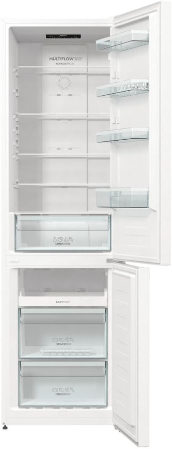 Отдельностоящий двухкамерный холодильник Gorenje NRK6201PW4 с шириной 60 см., благодаря технологии Slot-In может быть установлен в нишу соответствующего размера. При этом все полки и ящики можно выдвинуть. С AdaptTech Cooling модель анализирует время, в которое дверца открывается чаще всего, и подстраивается под ваше расписание: в данные промежутки температура внутри понижается, что позволяет избежать перегрева продуктов. MultiFlow 360° отвечает за равномерное распределение холодного воздуха по всем полкам, сохраняя еду свежей как можно дольше. Помимо автоматической разморозки обоих отделений, устройство оснащено функцией NoFrost Plus, при которой на стенках и полках не образуются иней или отложения льда, что продлевает срок службы и упрощает поддержание прибора в чистоте. Дверные полки можно переставлять на удобную для вас высоту. Если вы долгое время не используете устройство, но оно остается подключенным к сети, оно переходит в Эко-режим, при котором понижается расход электроэнергии. Светодиодные лампы расположены на потолке. Они практически не нуждаются в замене, потребляют меньше ресурсов и не нагреваются во время работы, обеспечивая при этом равномерное освещение холодильной камеры. С увеличенными ящиками SpaceBox у вас есть возможность хранить продукты любых размеров. При этом они легко выдвигаются и фиксируются в одном, удобном для вас, положении. Конструкция отдельностоящего двухкамерного холодильника Горенье NRK6201PW4 подразумевает наличие 5 стеклянных полок в холодильном отсеке и 3 дверных. Дверца спроектирована таким образом, что для ее открытия не нужно дополнительное место. Вы можете поставить прибор вплотную к другой мебели на кухне и при этом иметь доступ ко всем полкам и ящикам холодильного и морозильного отделений. Управление электронное. Цифровой дисплей удобно расположен за дверцей. Ключевые преимущества: Система MultiFlow 360° Slot-in: установка в нишу шириной 60 см Функция FastFreeze