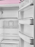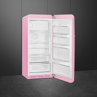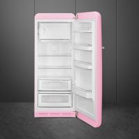 Холодильник Smeg FAB28RPK5 из коллекции 50-х годов представлен в розовом цвете. Светодиодная подсветка в холодильном отделении расположена сбоку. Поэтому она не загораживается продуктами и ярко освещает внутреннее пространство. Благодаря двум регулируемым полкам в камере можно легко разместить любую посуду.