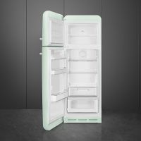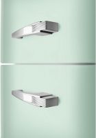 Холодильник Smeg FAB30LPG6 сочетает в себе изысканную эстетику эпохи 50-х и современные бытовые технологии, создавая яркий акцент в интерьере любой кухни. Корпус выполнен в насыщенном зелёном оттенке с серебристой фурнитурой, что подчёркивает ретро-образ и придаёт пространству характерный винтажный шарм. Высота 172 см, ширина 60,1 см и глубина 72,8 см (78,8 см с ручкой) обеспечивают оптимальный баланс между вместительностью и компактностью, позволяя размещать модель отдельно, сохраняя классический форм-фактор. Общий объём 294 литра включает холодильную камеру 222 л и морозильную секцию 72 л, что делает прибор удобным для повседневного хранения продуктов семьи средней величины. Интерьер разработан с вниманием к эргономике: в холодном отсеке предусмотрены две регулируемые и одна фиксированная стеклянная полка, полка для бутылок, прозрачная полка на дверце с крышкой и ещё одна регулируемая ниша на дверном полотне, а также отдельный ящик для овощей и фруктов. Такая компоновка обеспечивает быструю организацию запасов и удобный доступ к продуктам разного типа.